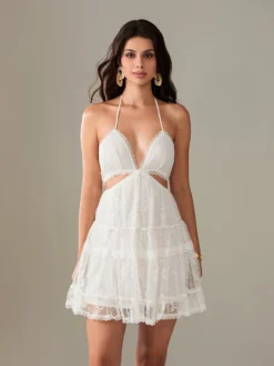 Women Mini Dress Lace V-Neck Tie-Up Halter Neck Hollow-Out Sleeveless Dress Summer Casual A-line Dress