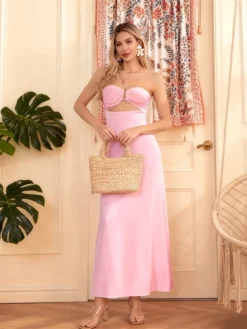 Strapless Dress for Women Stylish Hollow Out Solid/Floral Print Bow Tie Back Sleeveless Tube Long Bodycon Dress