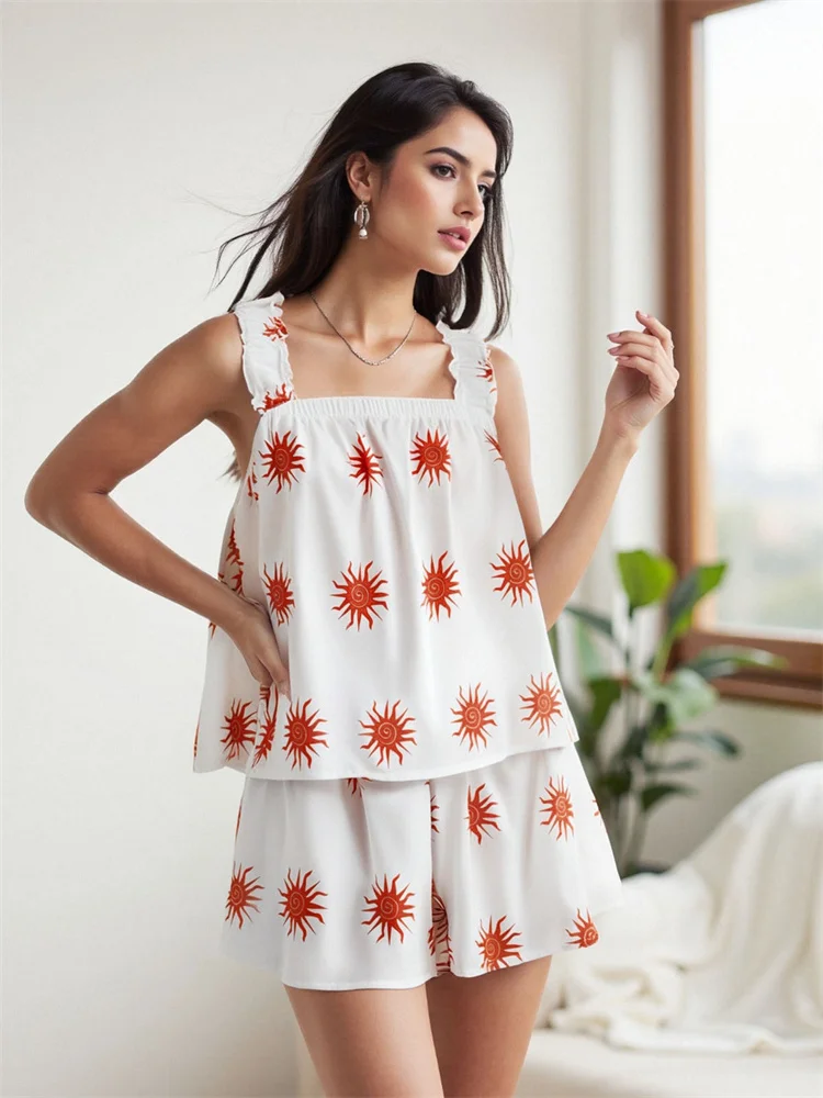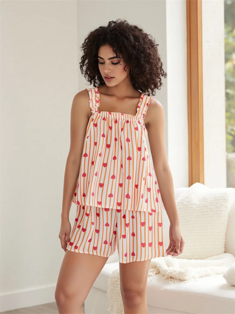 Womens Casual 2 Piece Outfits Sleeveless Sun/Heart Print Tank Tops + Shorts Set Loungewear